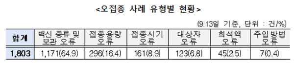 이 중 ‘백신 종류 및 보관 오류’로 인한 오접종이 1171건으로 전체 64.9%를 차지한 것으로 확인됐다.