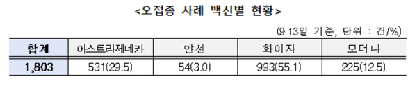 또한 백신별 오접종 사례를 살펴보면 화이자가 993건으로 55.1%를 차지했으며, 아스트라제네카는 531건, 모더나는 225건, 얀센은 54건인 것으로 나타났다.