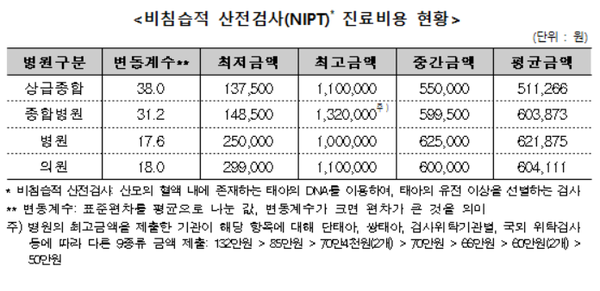 국민의 공개요구가 높았던 신규항목 중 비침습적 산전검사(Non-invasive Prenatal Testing, NIPT)는 평균과 중간·최고 금액이 병원급과 의원에서 유사한 수준을 보였다.