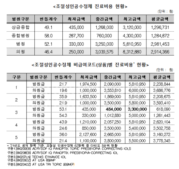 백내장 수술시 사용하는 조절성인공수정체의 경우 의원 최고금액이 병원보다 높았고, 조절성인공수정체 상품별로는 동일 상품에서 6배 이상의 가격 차이를 보이는 경우도 확인됐다.