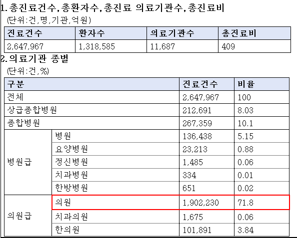 의료기관 종별 진료건수를 살펴보면 ▲동네의원이 190만 2230건으로 전체 비대면 진료건수의 약 72%를 차지했다. 이어 ▲종합병원 26만 7359건 ▲상급종합병원 21만 2691건 순으로 나타났다.