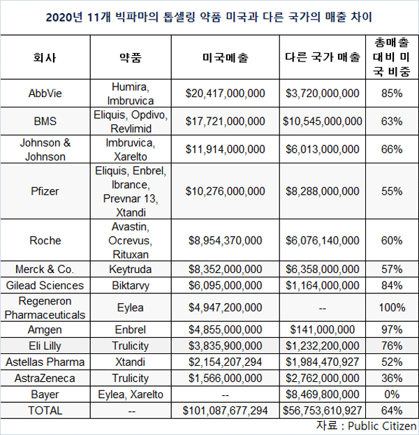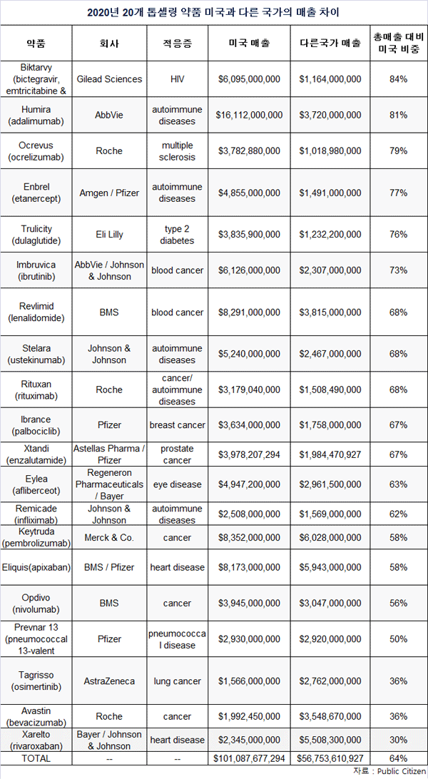 시민 단체인 퍼블릭시티즌(Public Citizen)의 최신 보고서를 보면, 글로벌 20개 톱셀링 약품은 2020년 미국에서 1011억 달러, 나머지 국가에서 568억 달러 등 총1580억 달러의 매출을 기록했다.