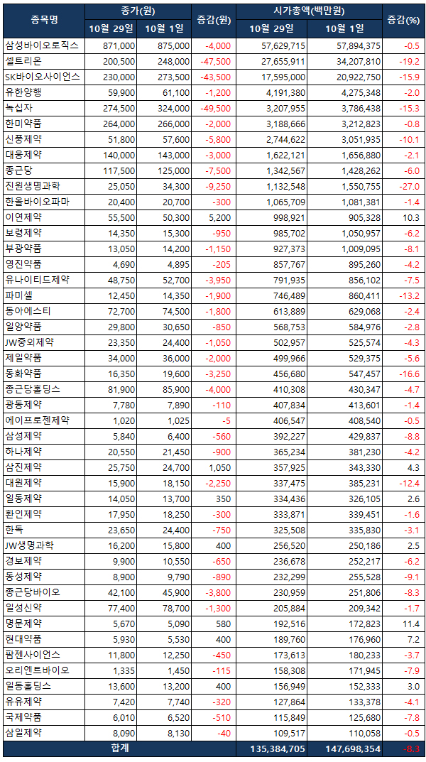 메디팜스투데이가 의약품업종 45개사의 시가총액을 살펴본 결과 10월 마지막날인 29일 종가기준 시총규모는 135조 3847억원으로, 첫날인 1일 147조 6984억원보다 8.3% 감소했다. 금액으로는 12조 3237억원이 줄었다.