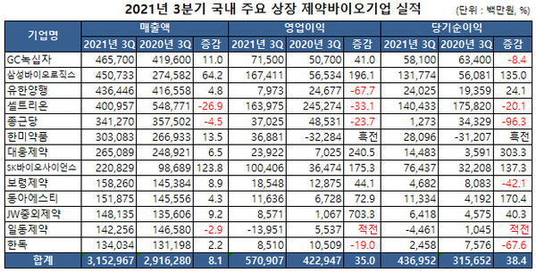 3분기 매출은 13개사 중 셀트리온과 종근당, 일동제약 3곳을 제외하고 성장세를 나타냈다. 영업이익은 GC녹십자와 삼성바이오로직스, 한미약품, 대웅제약, SK바이오사이언스, 보령제약, 동아에스티, JW중외제약 등 8곳이 성장했다. 당기순이익은 삼성바이오로직스, 유한양행, 한미약품, 대웅제약, SK바이오사이언스, 동아에스티, JW중외제약 등 7곳이 증가했다.
