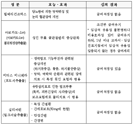 빌베리건조엑스는 '당뇨병에 의한 망막변성 및 눈의 혈관장애 개선' 적응증을 갖고 있으며, 실리마린(밀크씨슬추출물)은 '독성간질환·간세포보호·만성간염·간경변' 적응증이 있다. 이들 두 성분은 급여적정성을 인정받지 못했다.