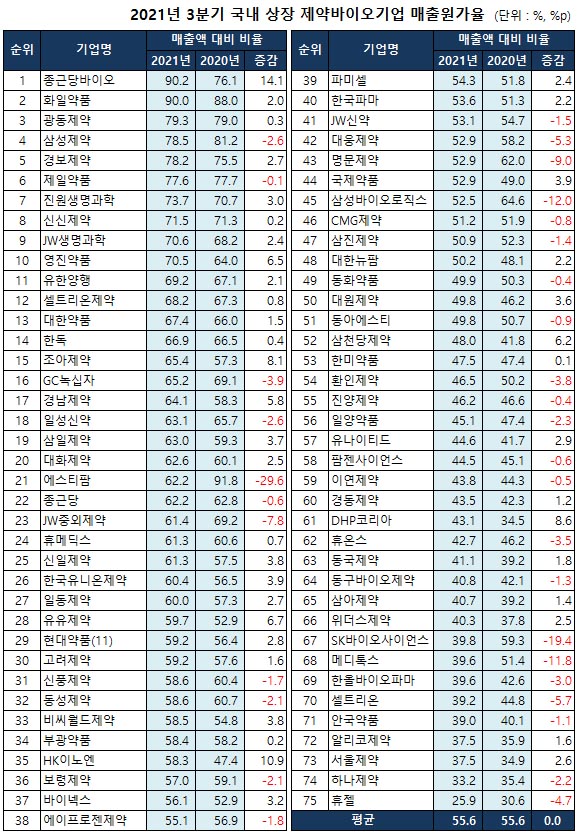 메디팜스투데이가 전자공시시스템에 제출된 2021년 3분기보고서를 토대로 국내 상장 제약바이오기업 75개사의 매출원가율을 살펴본 결과 평균 56.6%로 나타났다. 이는 전년 동기와 같은 수치다.