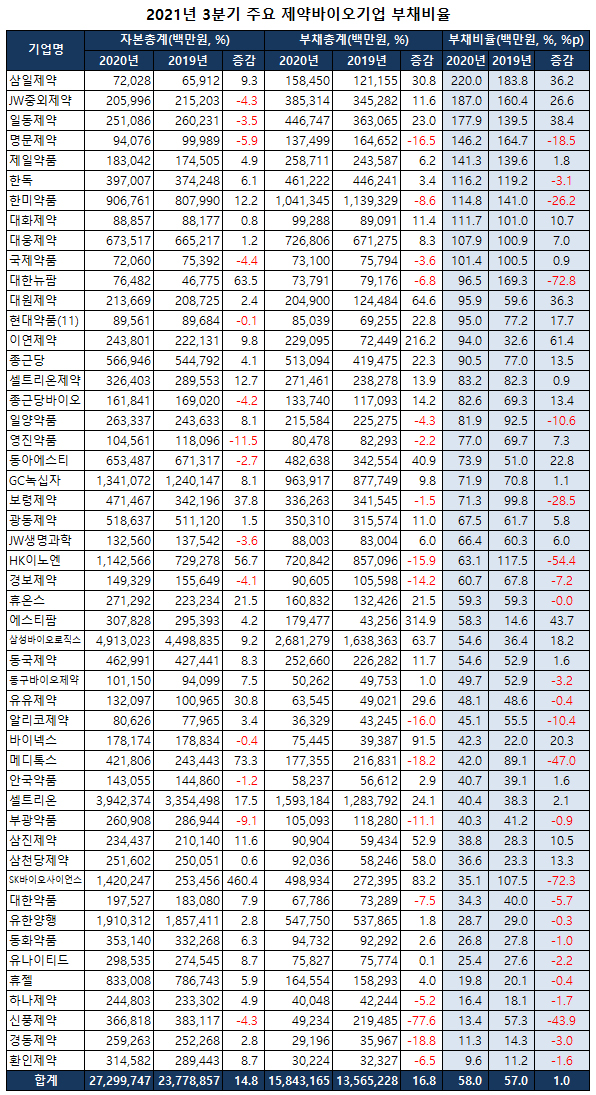 올해 3분기 국내 주요 제약바이오기업의 부채비율은 지난해 같은 기간보다 소폭 증가했으나 평균 60%는 넘지 않아 코로나19에도 선방한 것으로 나타났다.