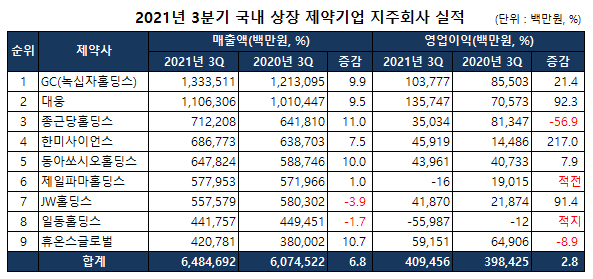 메디팜스투데이가 전자공시시스템에 제출된 2021년 3분기보고서를 토대로 국내 9개 제약기업 지주회사의 실적을 살펴본 결과 매출은 전년 대비 6.8% 증가한 6조 4847억원, 영업이익은 2.8% 증가한 4095억원을 기록했다.