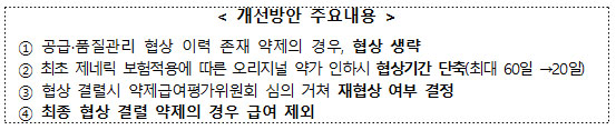 최초 제네릭 보험적용에 따른 오리지널 약가 인하시 협상기간이 대폭 단축되고, 최종 협상 결렬 약제의 경우 급여에서 삭제되는 등 약제 협상제도가 개선된다.