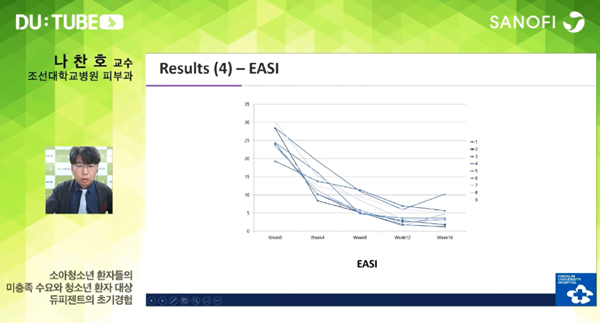 지난해 10월부터 올해 10월까지 1년간 12세~17세 중등도 이상 환자 9명을 대상으로 듀피젠트를 투여 후 EASI 등 각종 지표를 확인한 결과, 유의하게 개선됐음을 확인했다.