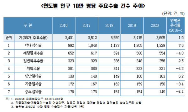 지난해 주요 수술환자는 약 160만명으로 집계됐으며, 진료비용은 총 7조 200억원을 들어간 것으로 나타났다.