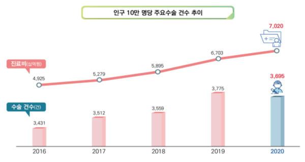 주요 수술 건당 진료비는 2016년 275만원에서 2020년 359만원으로 연평균 7.0% 증가했다.