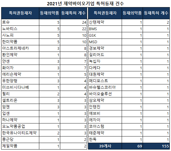 식품의약품안전처 의약품특허목록에 따르면 2021년 새로 등재된 특허는 39개사 총 155건으로, 2020년 222건 대비 30.2% 감소했다.