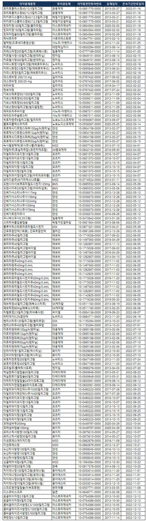 식품의약품안전처 의약품 특허목록에 따르면 올해 특허만료 품목 수는 전체 159개 품목에 달했으나, 특허도전으로 특허가 무효화 등 이유로 삭제된 39개 품목을 제외하고 총 120개 품목으로 집계됐다.