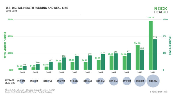 컨설팅 업체인 록 헬스(Rock Health)의 새로운 보고서에 따르면, 2021년 미국 디지털 헬스 벤처 펀딩은 전년에 비해 약 2배 증가한 291억 달러를 기록했다.