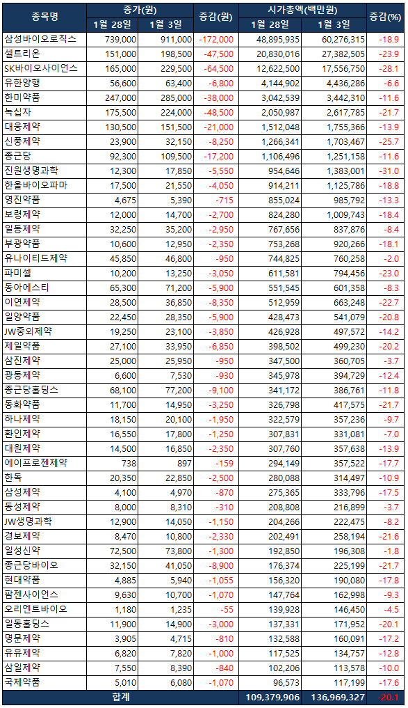 메디팜스투데이가 의약품업종 45개사의 시가총액(이하 시총)을 살펴본 결과 1월 마지막날인 28일 종가기준 시총규모는 109조 3799억원으로, 올해 첫 개장일인 1월 3일 136조 9693억원보다 20.1% 감소했다. 금액으로는 27조 5894억원이 줄어든 것이다.