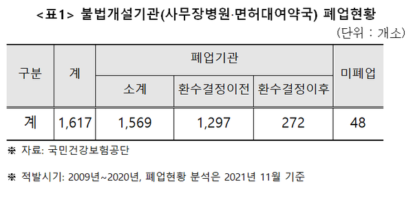 이중 휴·폐업기간을 파악할 수 있는 1617개소를 분석해보면, 그중에서 97%(1,569개소)가 폐업한 것으로 집계됐다. 당국에 적발된 사무장병원과 면허대여약국은 사실상 전부 폐업한다는 의미다. 미폐업 기관은 단 3%(48개소)에 불과했다.