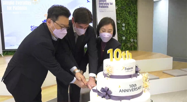 한국베링거인겔하임은 22일 오후 제2형 당뇨병치료제 '트라젠타'의 출시 10주년을 기념해 ‘트라젠타의 과거, 현재 그리고 미래 – Simple Everyday for Patients’를 주제로 온라인 미디어 세션을 개최하고 케이크 커팅식을 가졌다.