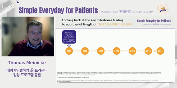 이날 토마스 마이니키 독일 베링거인겔하임의 전 트라젠타 임상 프로그램 총괄은 "트라젠타는 지난 10년간 지속적인 연구를 통해 나이, 신기능, 인종 , BMI(체질량지수) 등과 무관하게 유의미한 혈당강하 효과를 확인했다"며 주요 임상 결과를 소개했다.