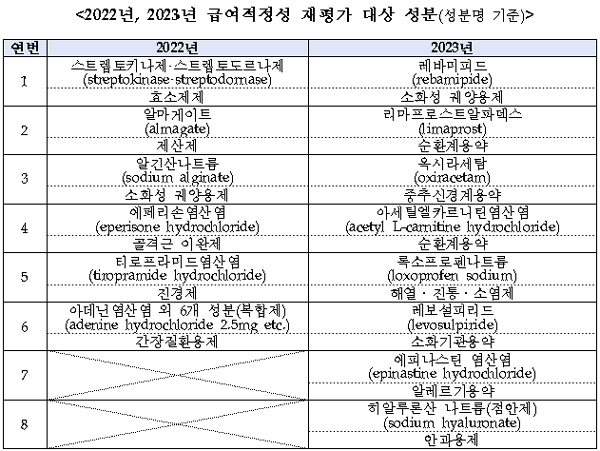 2023년 재평가 대상은 ▲레바미피드(소화성 궤양용제) ▲리마프로스트알파덱스(순환계용약) ▲옥시라세탐(중추신경계용약) ▲아세틸엘카르니틴염산염(순환계용약) ▲록소프로펜나트륨(해열·진통·소염제) ▲레보설피리드(소화기관용약) ▲에피나스틴 염산염(알르레기용약) ▲히알루론산 나트륨(점안제, 안과용제) 등이다.
