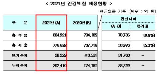 국민건강보험공단(이사장 강도태)은 2021년도 국민건강보험 재정 당기수지(현금흐름 기준)는 2조 8229억원 흑자로 집계되었고, 누적 적립금은 20조 2410억원을 보유하게 되었다고 밝혔다.