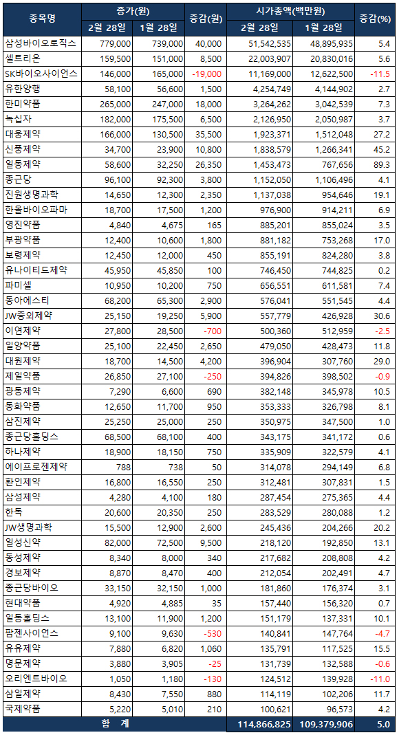 메디팜스투데이가 의약품업종 45개사의 시총을 살펴본 결과 2월 마지막날인 28일 종가기준 시총규모는 114조 8668억원으로, 전월 마지막 거래일인 1월 28일 109조 3799억원보다 5.0% 증가했다.