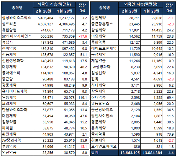 바이오 3대장 중 삼성바이오로직스와 셀트리온의 외국인 보유주식은 한 자릿수 증가율을 보여 전체 외국인 시총규모 축소를 방어했다. 삼성바이오로직스는 전월 대비 3.2% 증가한 5조 4065억원, 셀트리온은 4.7% 증가한 4조 5071억원을 기록했다.