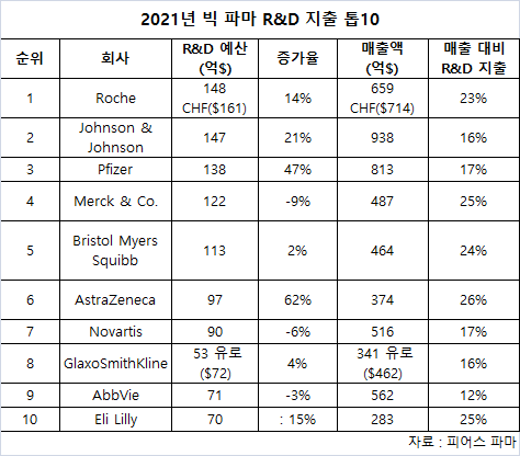 로슈는 2021년 R&D 지출이 148억 CHF(161억$)로 전년대비 14% 증가했다.