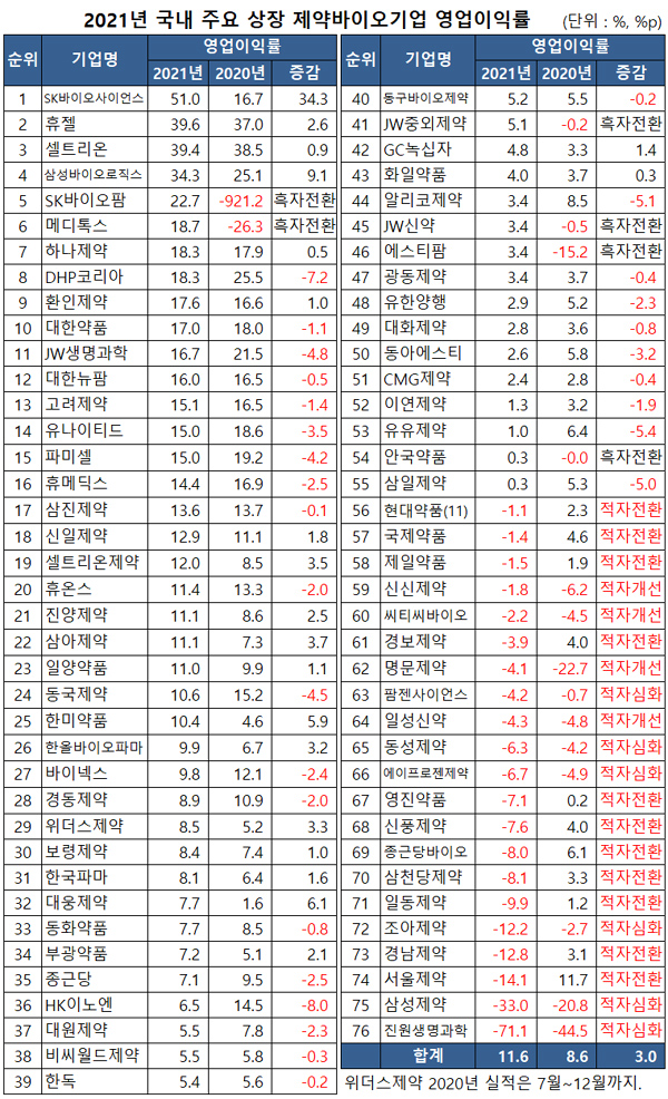 메디팜스투데이가 금융감독원에 제출된 2021년 사업보고서 등을 토대로 76개 국내 상장 제약바이오기업의 영업이익률을 살펴 본 결과 평균 영업이익률은 11.6%로 전년 8.6% 대비 3.0%p 성장했다.