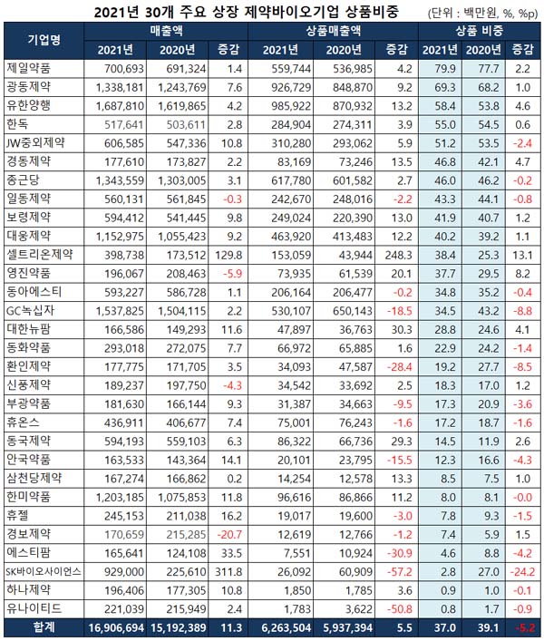 메디팜스투데이가 금융감독원에 제출된 2021년 사업보고서를 토대로 국내 30개 주요 제약기업의 상품매출 비중을 살펴본 결과, 평균 37.0%로 전년 39.1%에 비해 5.2%p 감소했다.