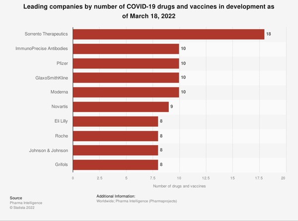 컨설팅 업체인 스타티스타(Statista)에 따르면, 소렌토 테라퓨틱스(Sorrento Therapeutics)가 파이프라인에 가장 많은 코로나바이러스 후보를 보유하고 있다.
