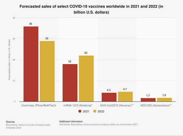 모더나와 화이자는 올해 각각 220억 달러, 290억 달러의 코로나19 백신 매출을 예상하고 있다.