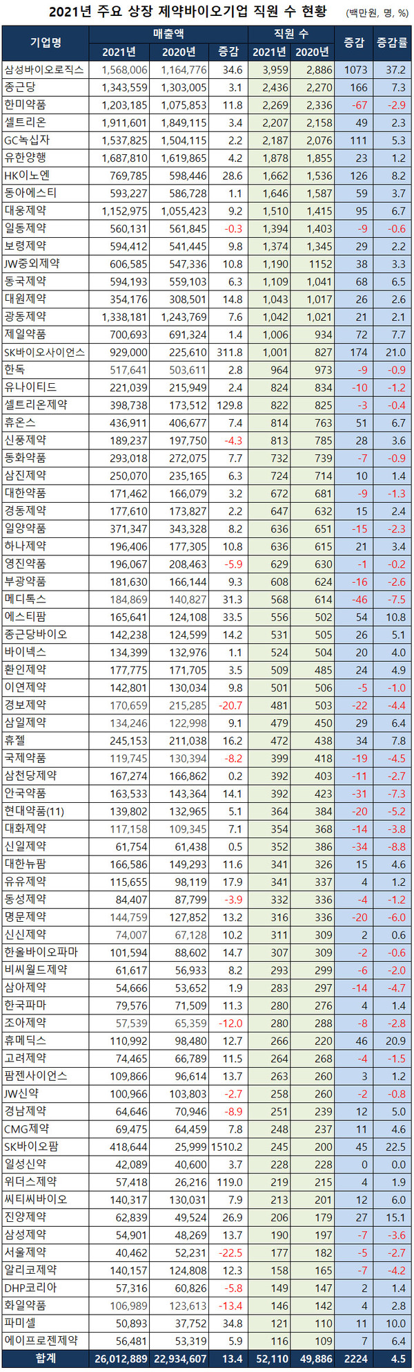 메디팜스투데이가 금융감독원에 제출된 2021년 사업보고서를 토대로 주요 상장 제약바이오기업 73곳의 직원 수를 살펴본 결과 총 직원 수는 5만 2110명으로 전년 4만 9886명 대비 4.5% 증가했다.