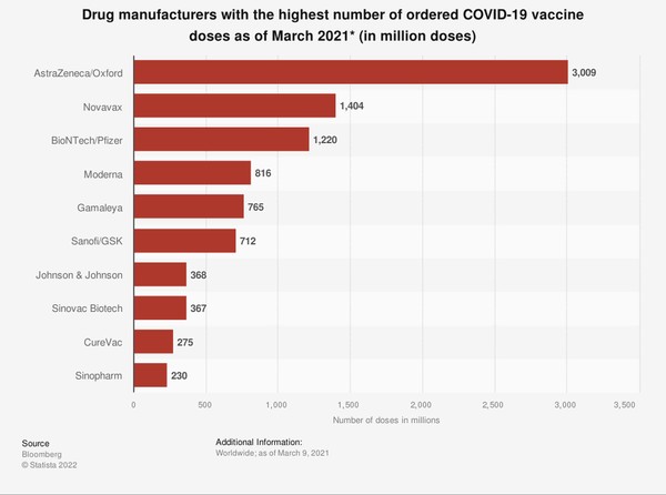 The Motley Fool의 보고서를 보면, 아스트라제네카(AZ)와 노바백스는 각각 30억회분, 14억회분의 공급계약을 체결했다.