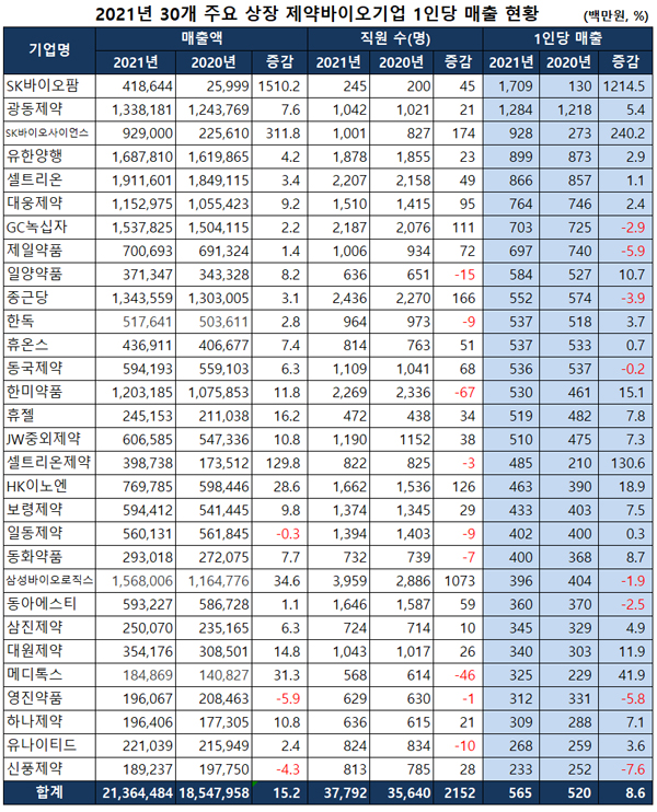 직원 1인당 매출이 가장 높은 곳은 17억원대에 달하는 SK바이오팜으로 전년보다 13배 증가했고, SK바이오사이언스와 셀트리온제약 등 매출이 급성장한 기업들의 증가폭이 컸다.