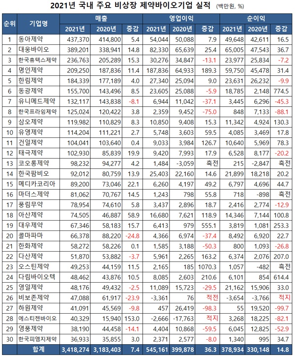 메디팜스투데이가 금융감독원에 제출된 2021년 감사보고서와 사업보고서를 토대로 주요 30개 비상장 제약기업의 실적을 살펴본 결과 이 같이 나타났다.