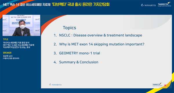 한국노바티스는 12일 국내 처음 출시된 MET 엑손 14 결손 비소세포폐암 치료제 '타브렉타(성분명 카프마티닙)'의 온라인 기자간담회를 개최했다.