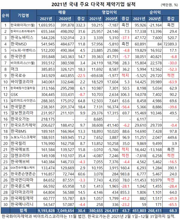 메디팜스투데이가 금융감독원에 제출된 주요 다국적 제약기업 30개사의 2021년도 감사보고서를 토대로 살펴본 결과 매출은 9조 1938억 원으로 전년 7조 497억원 대비 30.4% 증가했다.