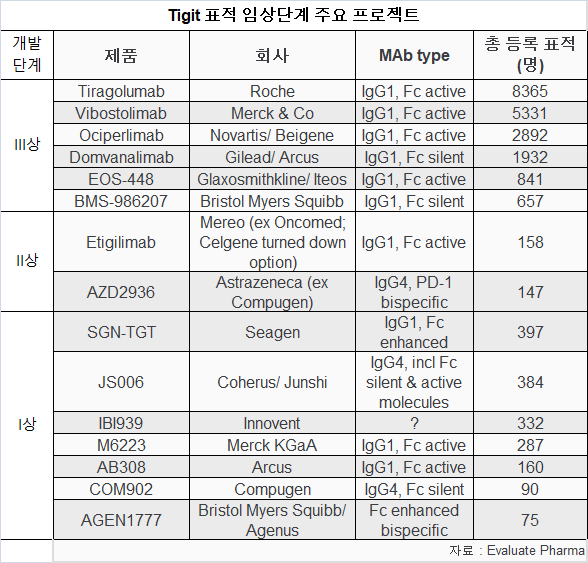 머크(MSD), BMS/아제누스, 길리어드/아르큐스, GSK/아이테오스, 메레오 바이오파마 등도 TIGIT 약품을 임상시험 중에 있다.