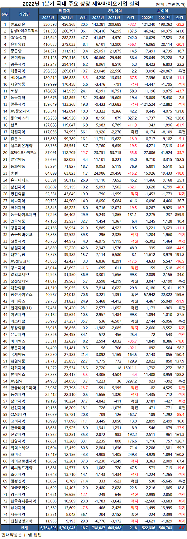 메디팜스투데이가 금융감독원에 제출된 2022년 1분기보고서를 토대로 국내 75개 상장 제약바이오기업의 실적을 살펴본 결과 매출은 6조 7646억원으로 전년 동기 대비 18.7% 증가했고, 영업이익은 7381억원으로 21.8% 증가해 우수한 성적표를 받았다.