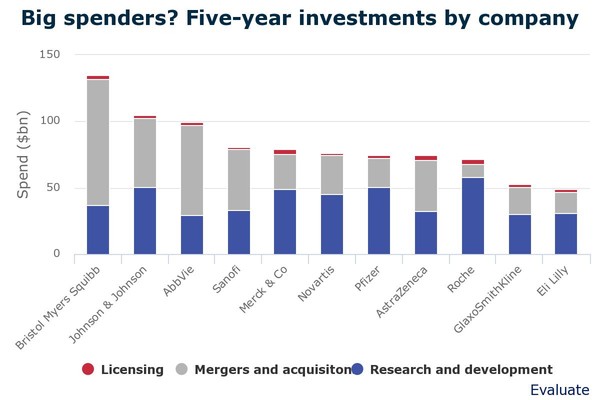 BMS는 5년간 M&A에 949억 달러를 지출했고, 애브비는 679억 달러를 투자했다.