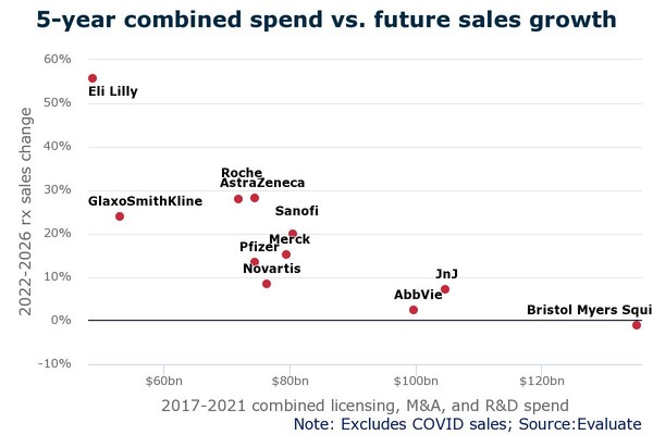 BMS가 2017년 이후 인수합병(M&A), 연구개발(R&D), 라이선싱 등에 가장 많이 지출한 반면, 릴리가 가장 적은 투자를 한 것으로 나타났다.