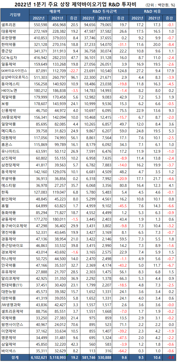 올해 1분기 상장 제약바이오기업들의 매출이 크게 성장한 가운데 5곳 중 3곳 가량은 연구개발(R&D) 투자비도 확대한 것으로 나타났다.