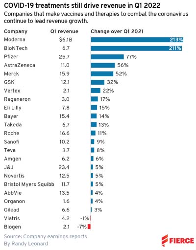 2022년 1분기, 화이자, 머크(MSD), 아스트라제네카(AZ), GSK, 모더나, 바이오엔 등 코로나19 백신과 치료제를 마케팅하는 업체들이 바이오파마 업계의 성장을 주도했다.