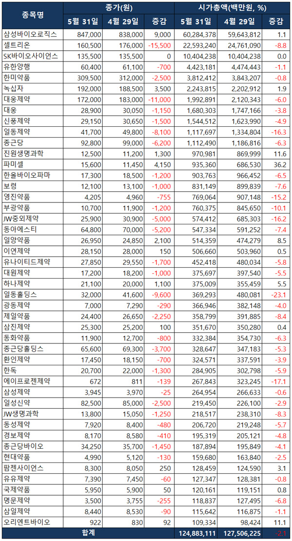 메디팜스투데이가 의약품업종 46개사의 시총을 살펴본 결과 5월 마지막날인 31일 종가기준 시총규모는 124조 8831억원으로, 전월 마지막 거래일인 4월 29일 127조 5062억원보다 2.1% 감소했다.