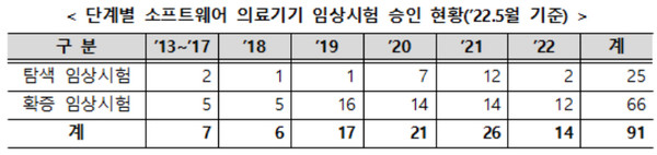 2013년~2017년 사이 7건에 불과했던 소프트웨어 의료기기 임상은 2018년 6건, 2019년 17건, 2020년 21건, 2021년 26건으로 꾸준히 증가했다.