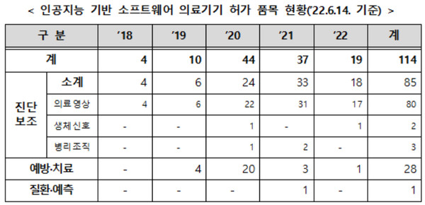 AI기반 소프트웨어 의료기기 허가 품목 현황에 따르면 현재까지 114개 품목이 허가됐다. 2018년 4개 품목에서 2019년 10개 품목, 2020년 44개 품목, 2021년 37개 품목으로 증가 추세에 있고, 올해는 6월 14일 기준 19개 품목이 허가됐다.