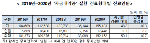 인구 10만 명당 ‘자궁내막증’ 환자의 진료인원을 연도별로 살펴보면 2020년 606명으로 2016년 414명 대비 46.4% 증가하였으며, 입원환자는 2016년 62명에서 2020년 68명(9.7%)으로 증가하였고, 외래환자는 2016년 401명에서 2020년 594명(48.1%)으로 증가한 것으로 나타났다.