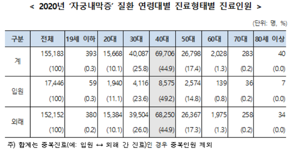 2020년 기준 ‘자궁내막증’ 환자의 연령대별 진료인원 구성비를 살펴보면, 전체 진료인원(155,183명) 중 40대가 44.9%(69,706명)로 가장 많았고, 30대가 25.8%(40,087명), 50대가 17.4%(26,978명)로 나타났다.