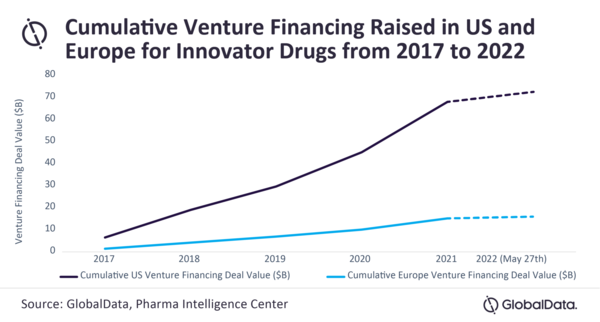2017년부터 2022년 5월 27일까지, 유럽 소재 바이오텍은 미국보다 혁신 약품에 대한 벤처 자금조달이 560억 달러 적었다.